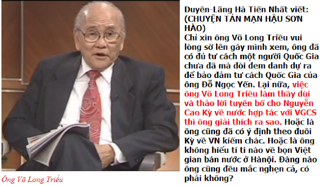 1/ Lập trường chính trị của Đỗ Ngọc Yến - Để bảo đảm giá trị của lời khẳng định của mình (Đỗ Ngọc Yến có lập trường Quốc Gia vững chắc,) KS Võ Long Triều đem danh dự của ông ra làm bảo chứng. Bảo chứng này có giá trị không thì lại phải tìm về quá khứ của người đứng ra bảo đảm mới biết được. Trong suốt thời gian làm Dân Biểu của Nền Đệ Nhị CH và làm chủ nhiệm tờ báo Đại Dân Tộc, ông Võ Long Triều đứng về phe nào, làm được gì cho đất nước thì mọi người đều còn nhớ. Kẻ hèn này viết ra sơ dài dòng quá. Chỉ xin ông Võ Long Triều vui lòng sờ lên gáy mình xem, ông đã có đủ tư cách một người Quốc Gia chưa đã mà đòi đem danh dự ra để bảo đảm tư cách Quốc Gia của ông Đỗ Ngọc Yến. Lại nữa, việc ông Võ Long Triều làm thầy dùi và thảo lời tuyên bố cho Nguyễn Cao Kỳ về nước hợp tác với VGCS thì ông giải thích ra sao. Hoặc là ông cũng đã có ý định theo đuôi Kỳ về VN kiếm chác. Hoặc là ông không hiểu tí ti nào về bọn Việt gian bán nước ở Hànội. Đàng nào ông cũng đều mắc nghẹn cả, có phải không?